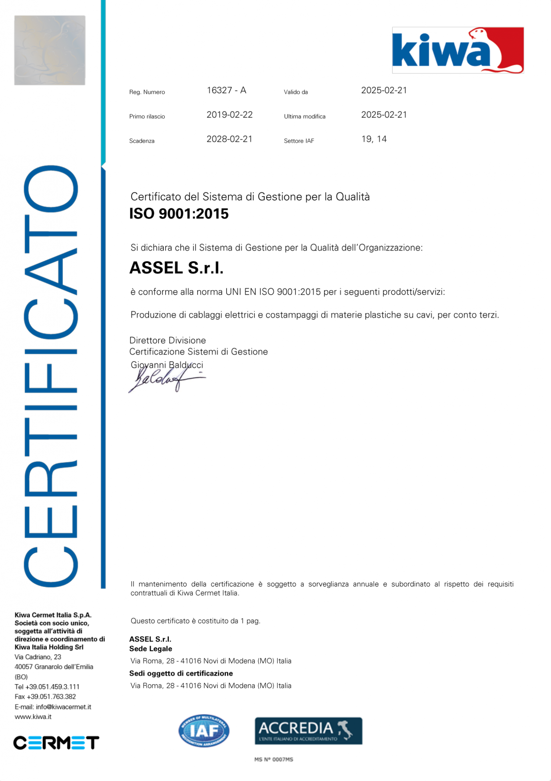 Assel è impegnata a fornire servizi di produzione, su specifica del cliente, di cablaggi elettrici, assemblaggi elettrici, costampaggio di cavi e connettori, che garantiscano la soddisfazione del cliente stesso attraverso: